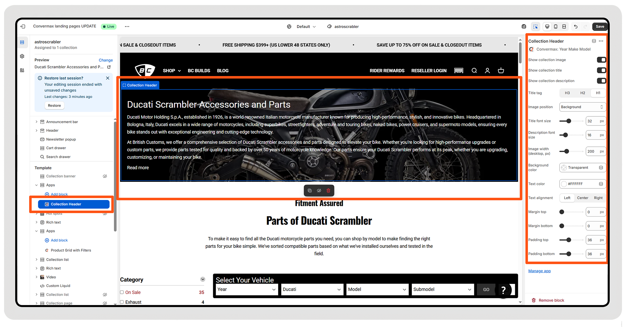 We added a new Vehicle Landing Page block in the Collections section of your Shopify Dashboard. You no longer need to enter metafield values manually. Instead, select values in the Year-Make-Model lookup and instantly link a collection page to a specific vehicle, range, etc. The block supports all fields marked as Fitment Search fields, not just Year, Make, Model, and Submodel.