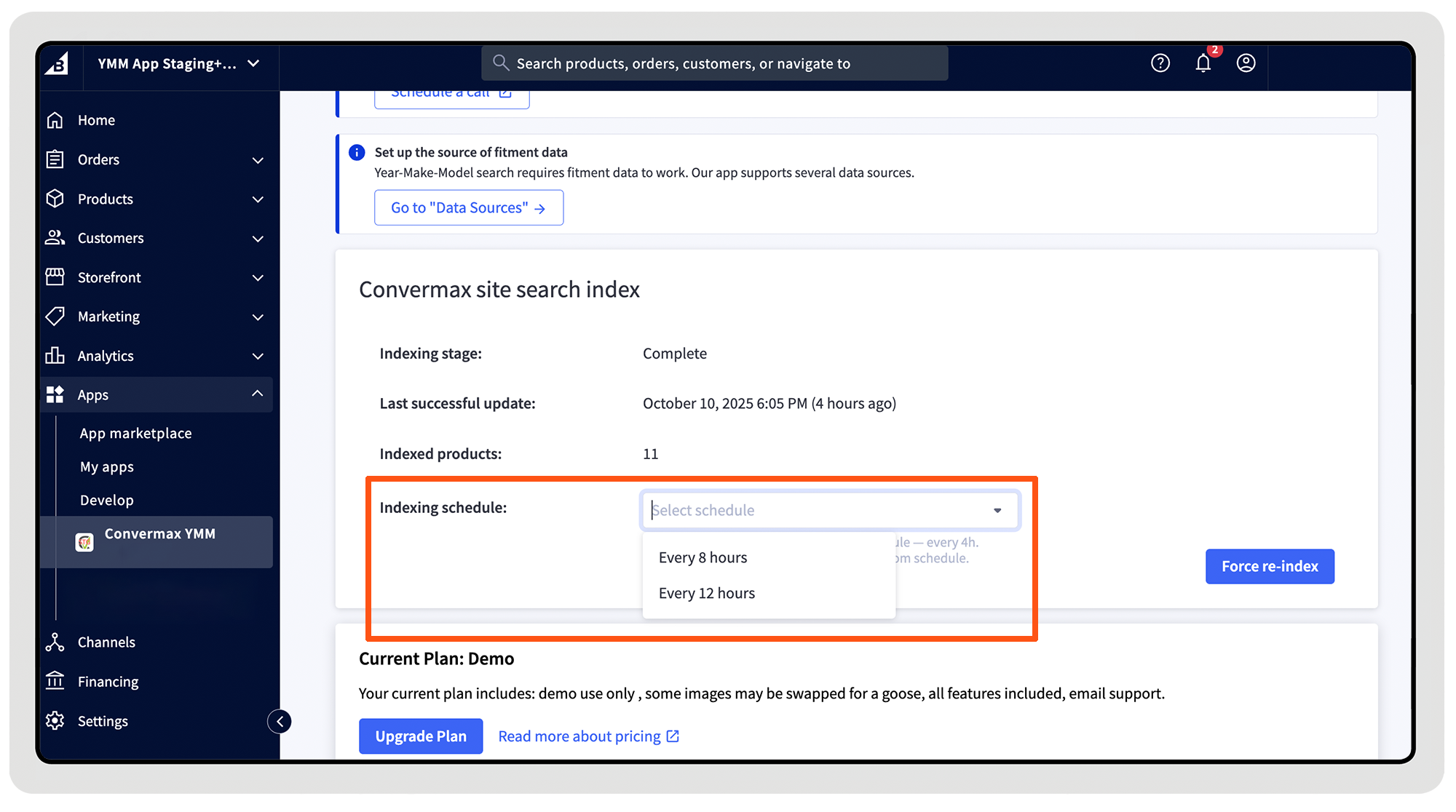 Now, inside our Shopify and BigCommerce apps, you can set your own indexing schedule. You decide how often your data refreshes: