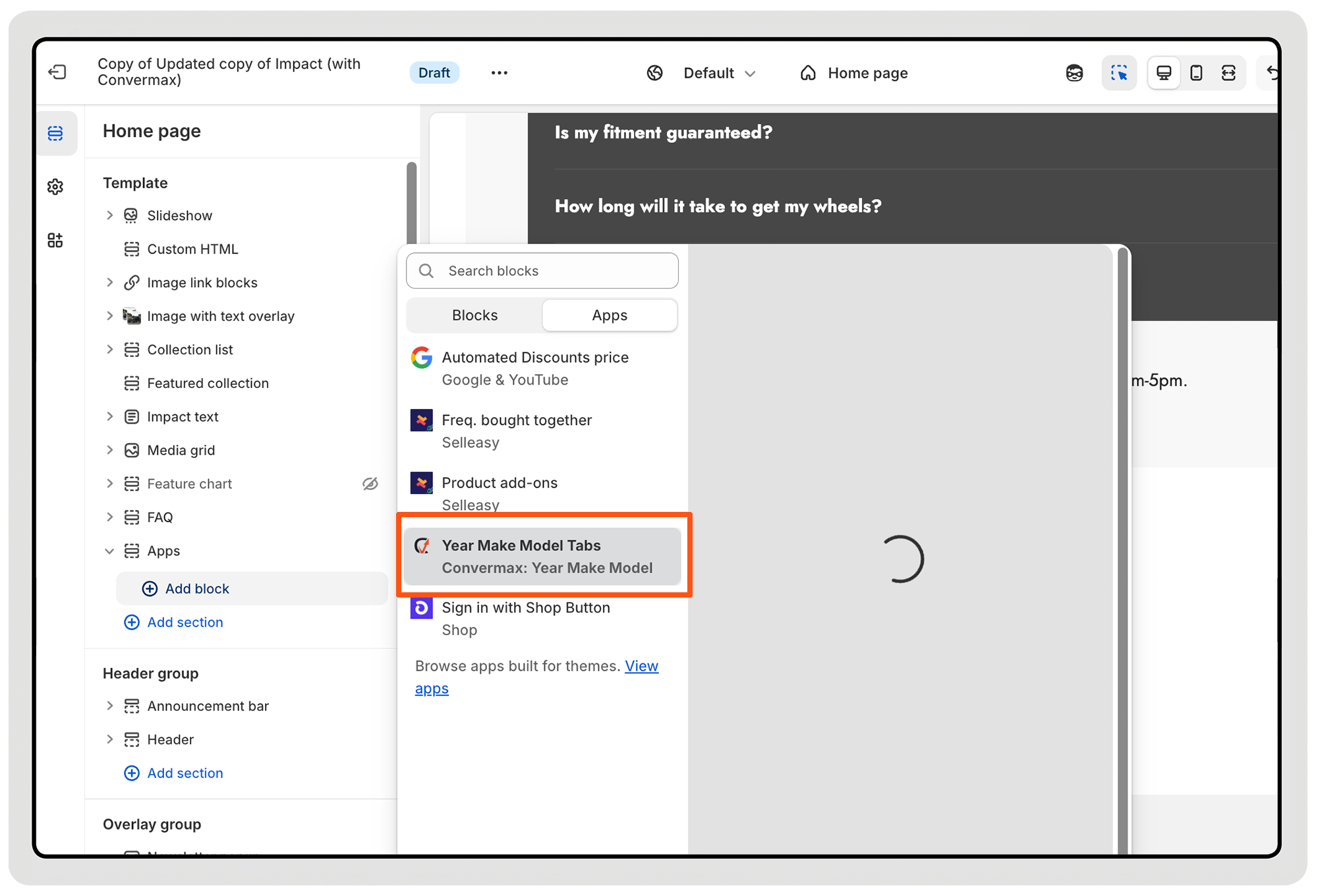 Many store owners — especially wheel & tire retailers — prefer using Year Make Model lookup with tabs on the homepage instead of a flat version. Usually, it includes such tabs as search by vehicle, search by wheels, and search by tires. Sometimes merchants prefer to add other options: search by VIN, Keyword, Brand, SKU, etc. Before, these tabs had to be built manually using custom code. And if the customer wanted to make some changes to the looku,p it required a support ticket, extra work and time. Now, merchants can create and customise their tabs directly from the Shopify Theme Editor.