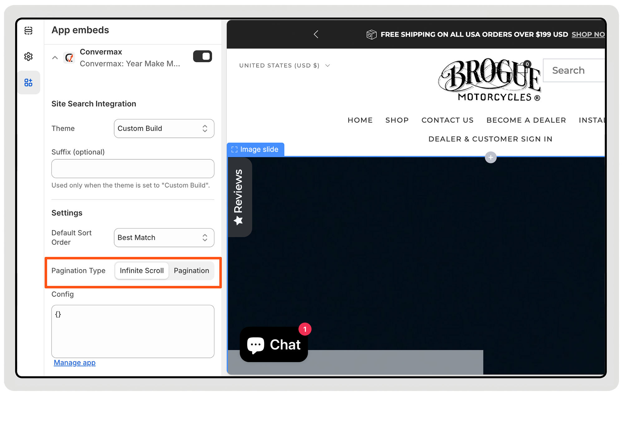Merchants now have the freedom to control how products are displayed on their search pages — no support ticket required. You can choose between two options: infinite scroll or classic pagination. To do so, open Theme Editor, choose Convermax among App embeds, and select the option you prefer.