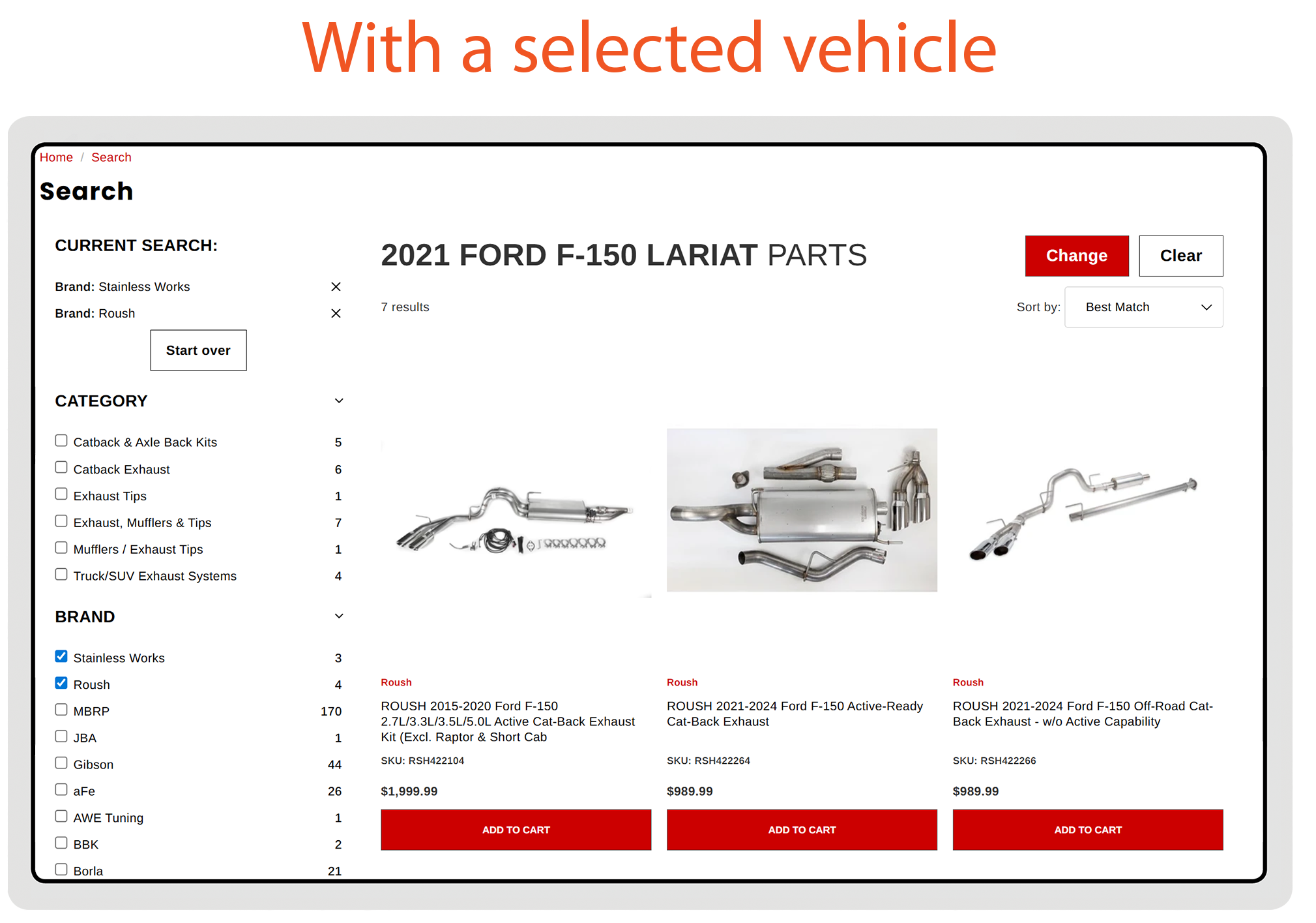 When a vehicle is selected: products that are either a confirmed fit or universal fit will be boosted, helping shoppers find parts that fit their vehicle.