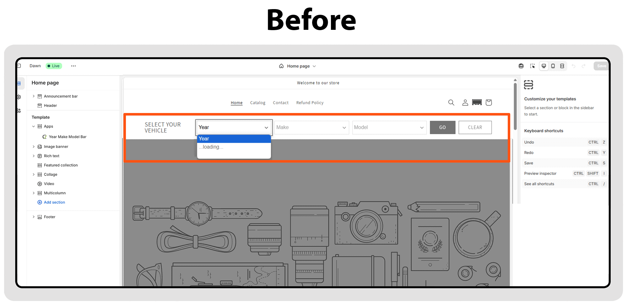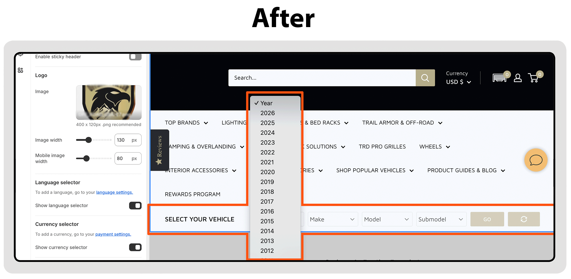 Shopify now allows apps to place widgets directly in the header group, and we updated our app so that users can easily add the Garage block. Previously, you could only add the Garage widget manually to the store’s theme liquid files. But no more code edits! Just drag and drop it where you want to display it.