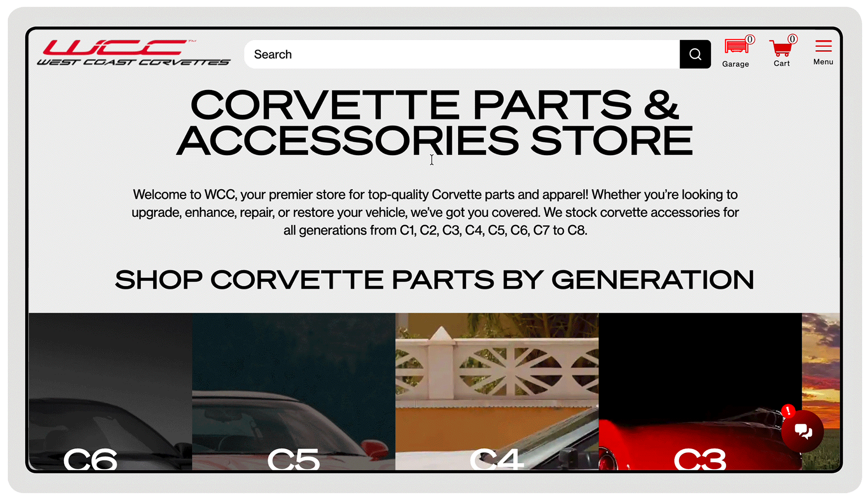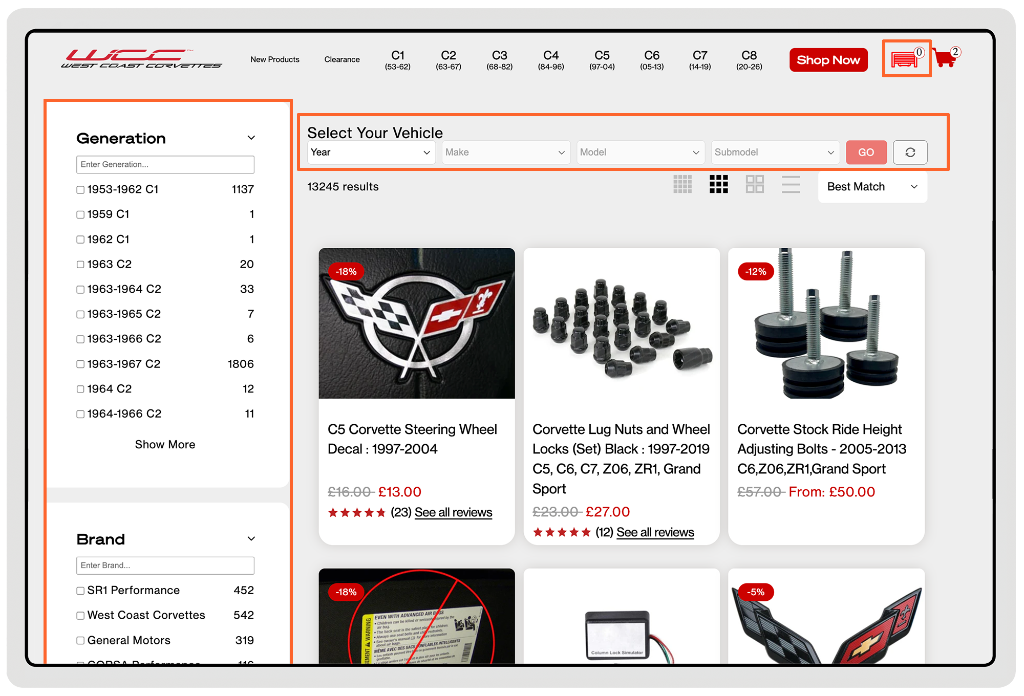 West Coast Corvette website uses a standard Convermax integration that includes Year-Make-Model lookup, My Garage, Verify Fitment on product pages, keyword search, and advanced filters. These tools work together to help shoppers quickly find parts that match their vehicle and navigate a large catalog without confusion.