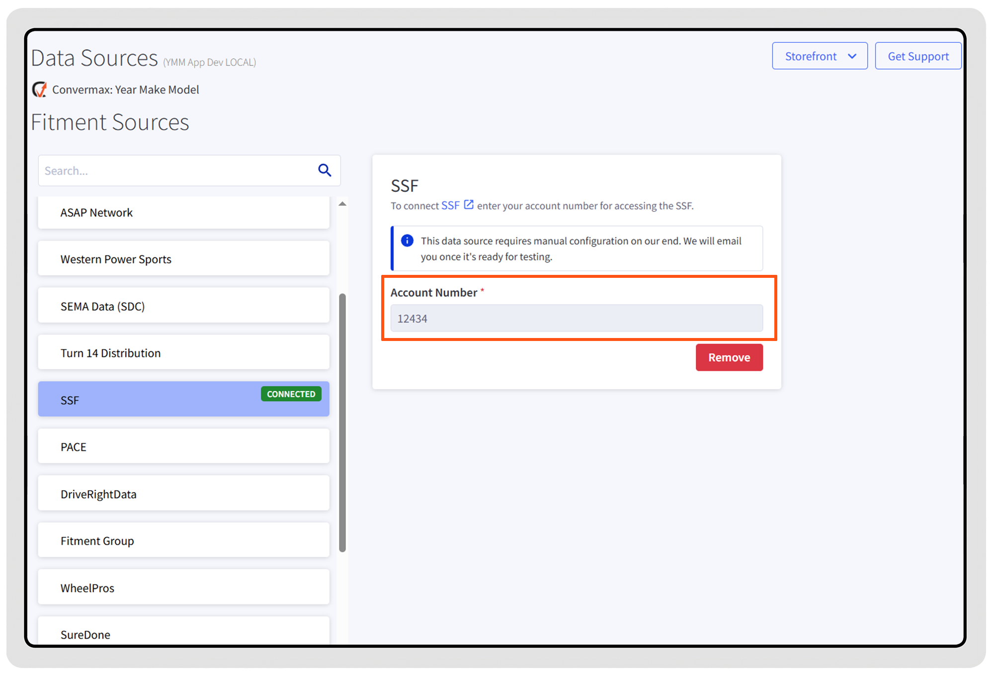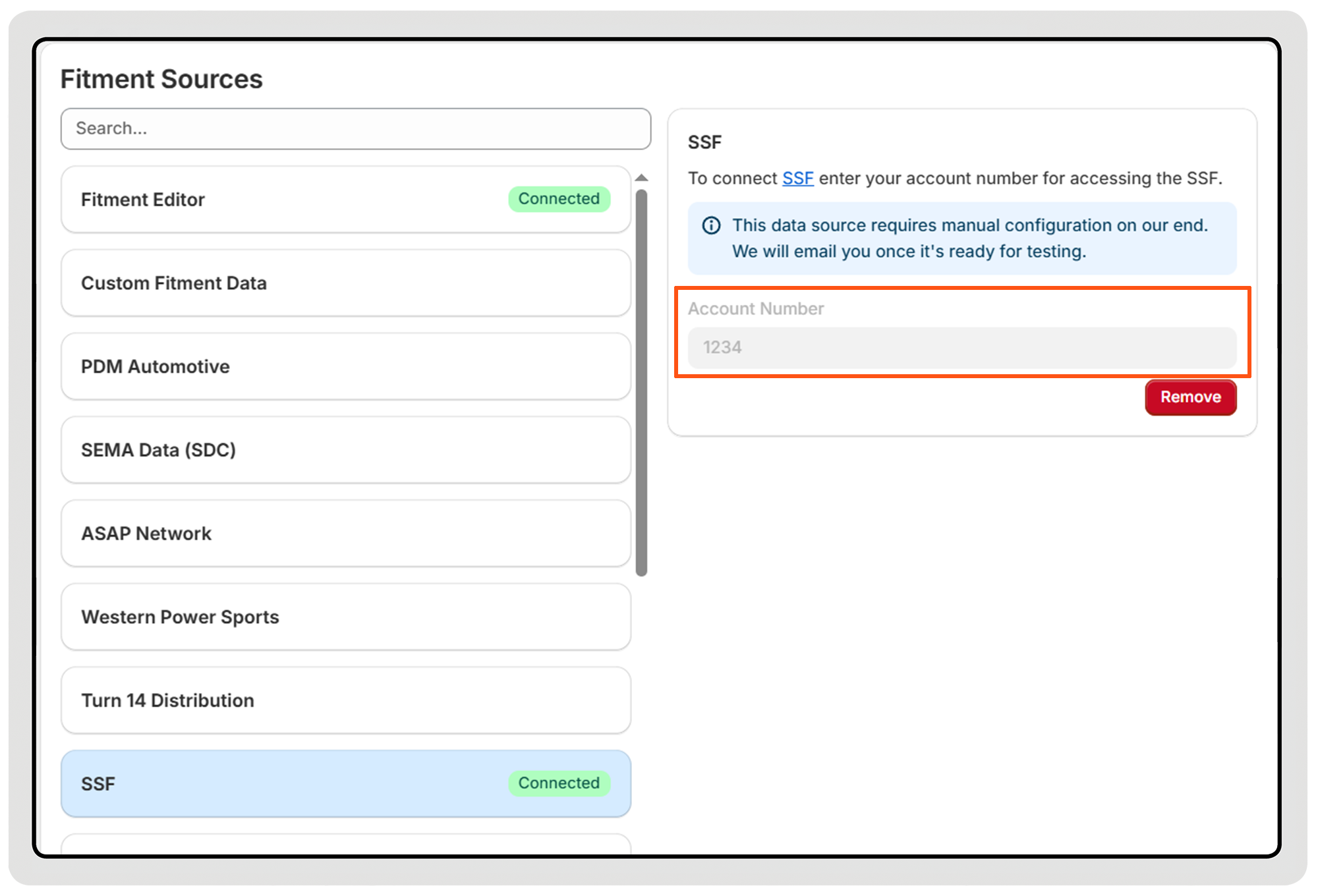 To enable it, merchants simply enter their SSF account number in the app. Once our support team confirms the account status with the SSF team, the data source is enabled for the store and fitment data becomes available for indexing.