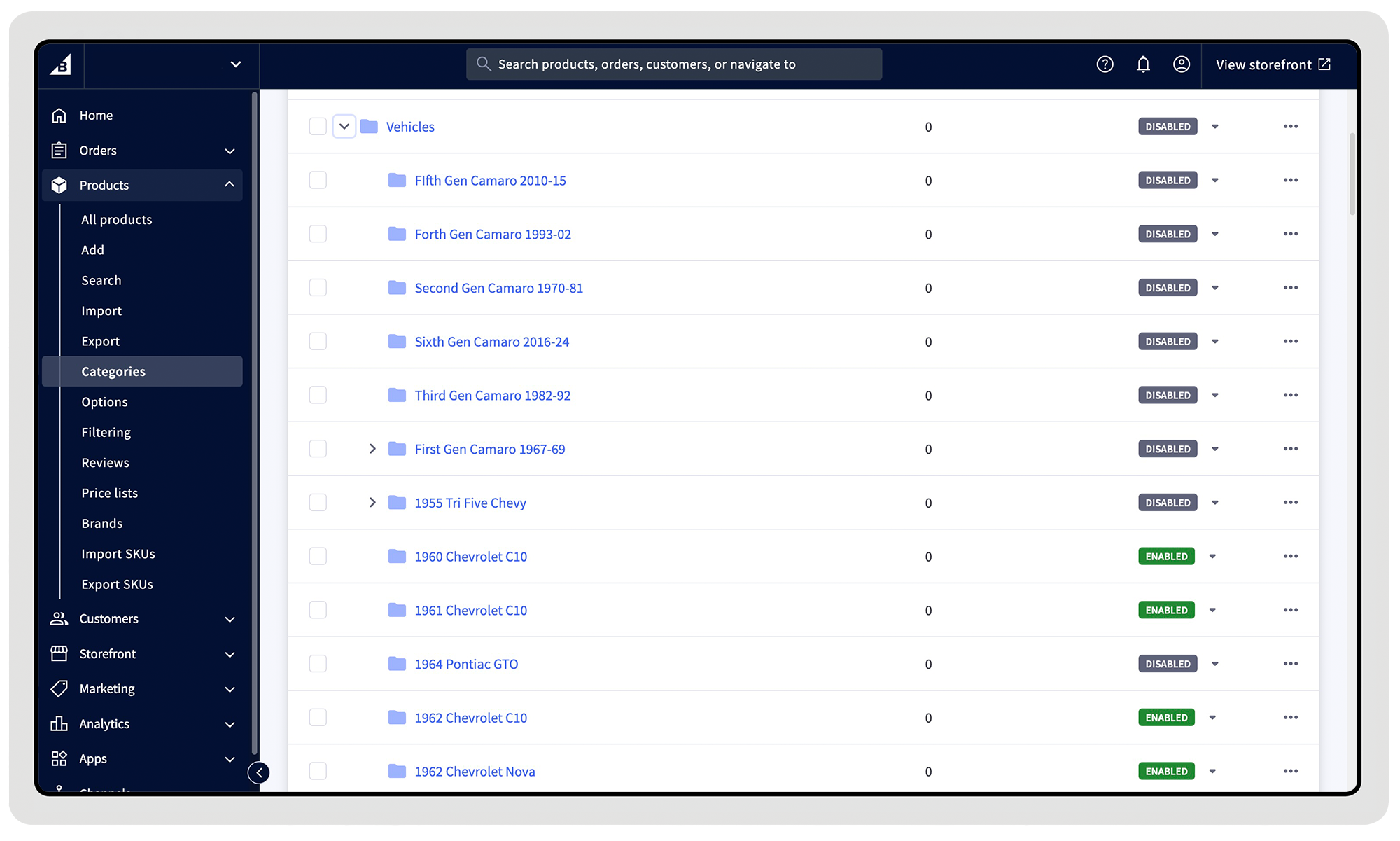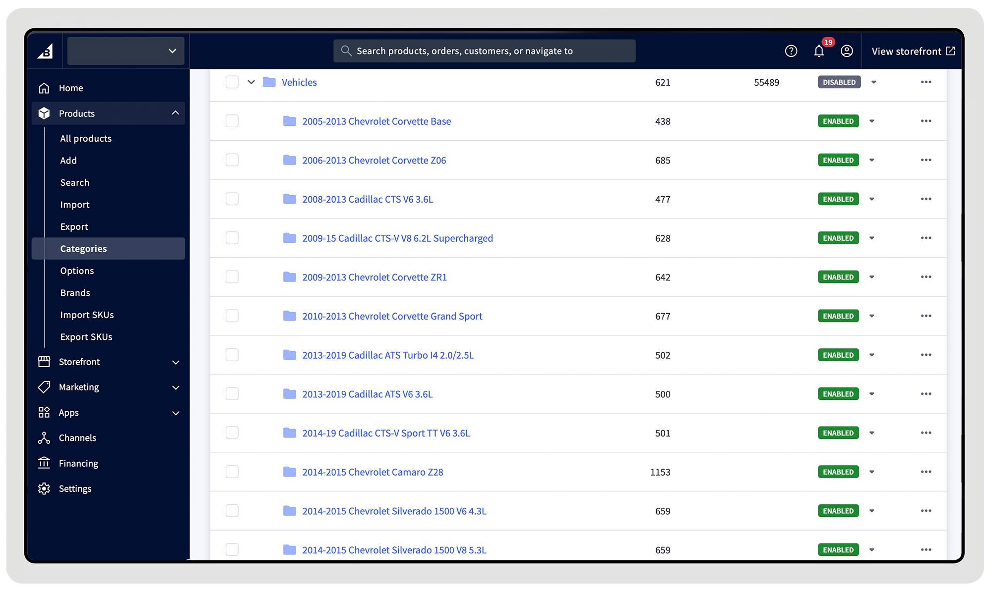 Another change is visible inside the BigCommerce admin. Before this update, when merchants opened “Categories” and selected a Vehicle Landing Page, it showed zero products assigned to that category. Now, merchants can see the actual number of products linked to each landing page directly in their dashboard.