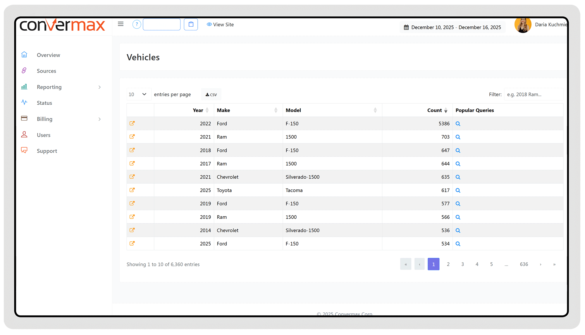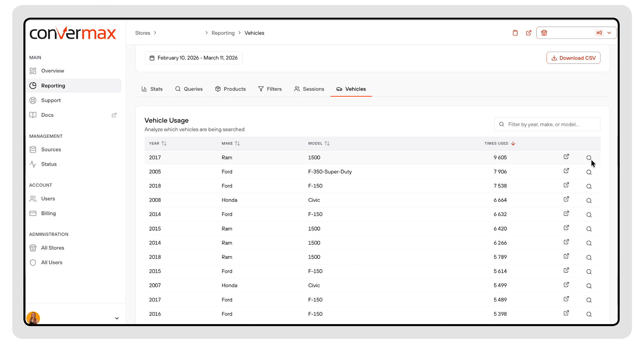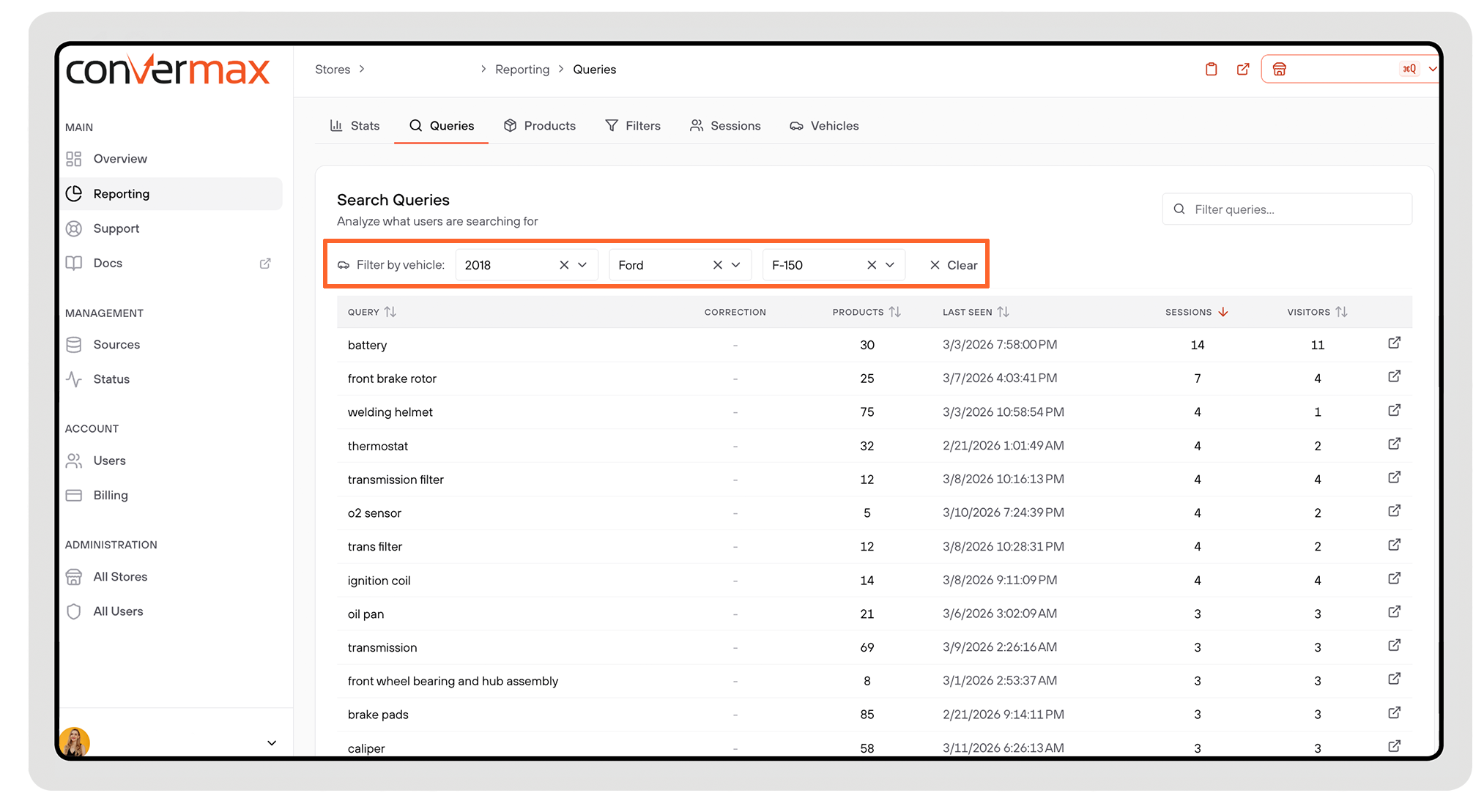 We’ve added a new Vehicle Search Queries report to the Convermax dashboard. It shows the most popular search queries filtered by vehicle, helping you understand what customers look for after they’ve selected a specific Year, Make, and Model. We hope understanding what customers search for after they choose a vehicle will help merchants improve product coverage and conversions.