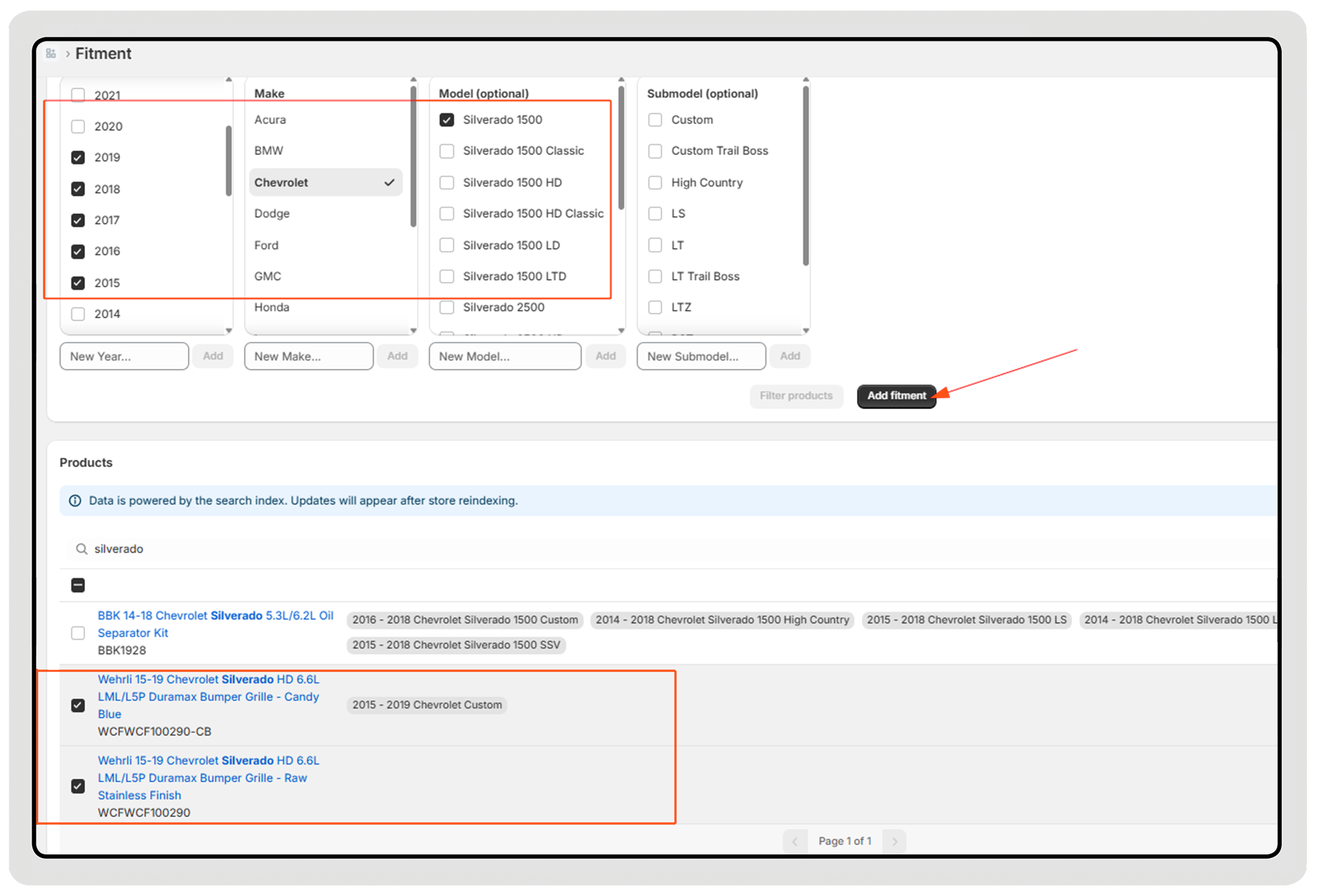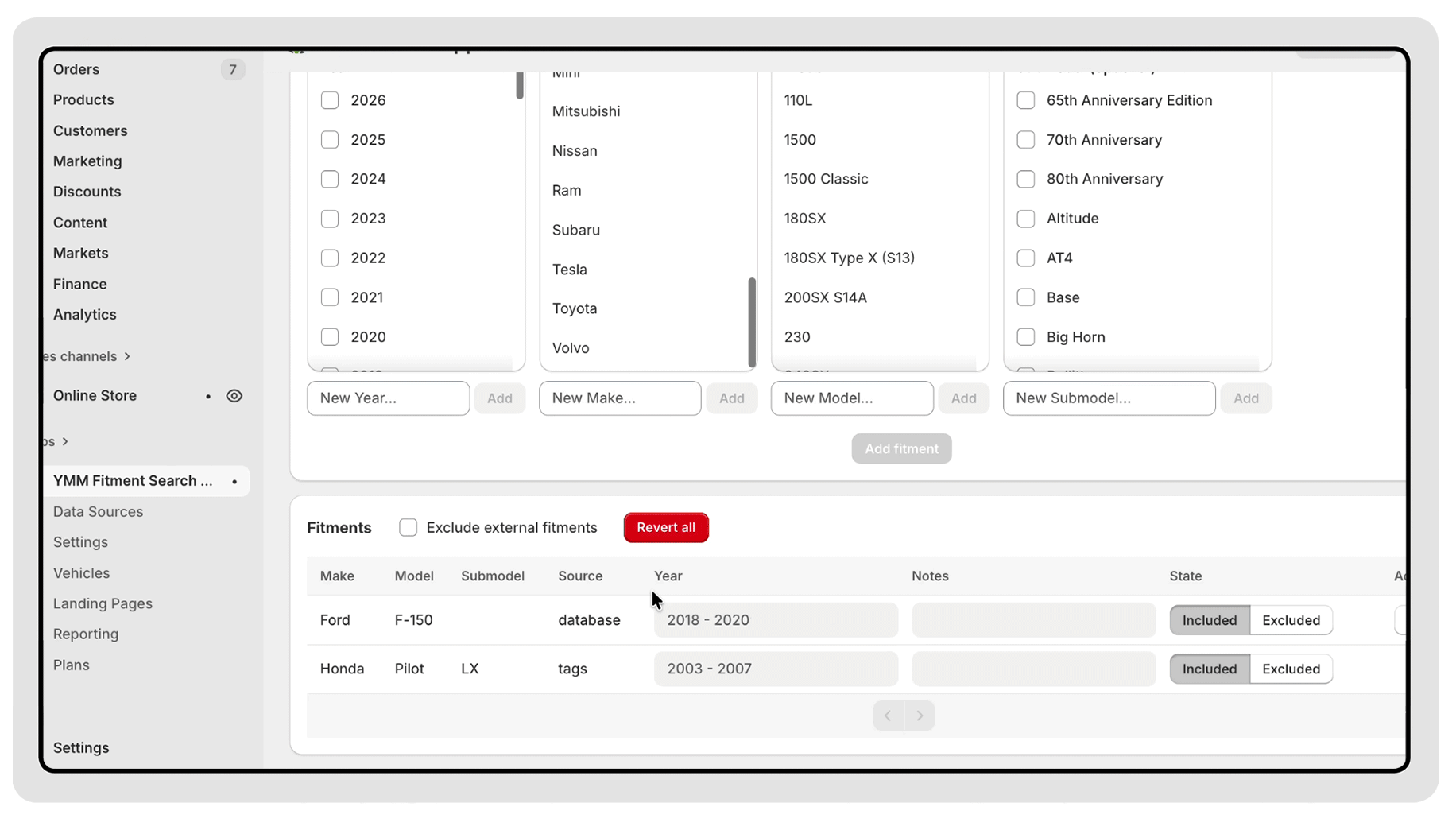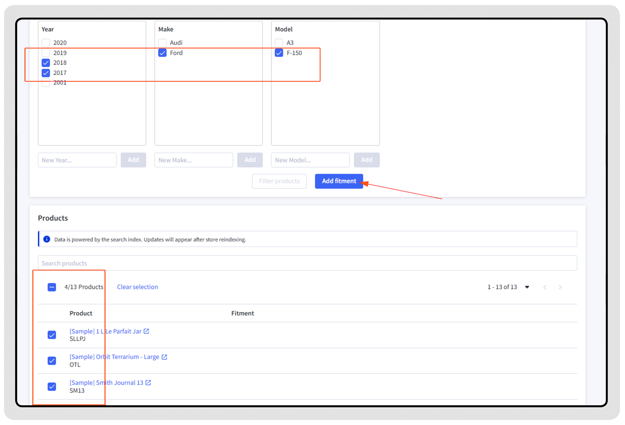 Look for products that mention “F-150” in the product title but have no fitment data, and add F-150 as a fitment in one step.