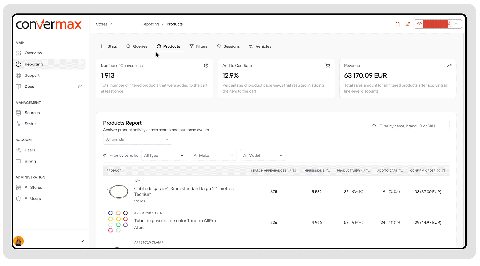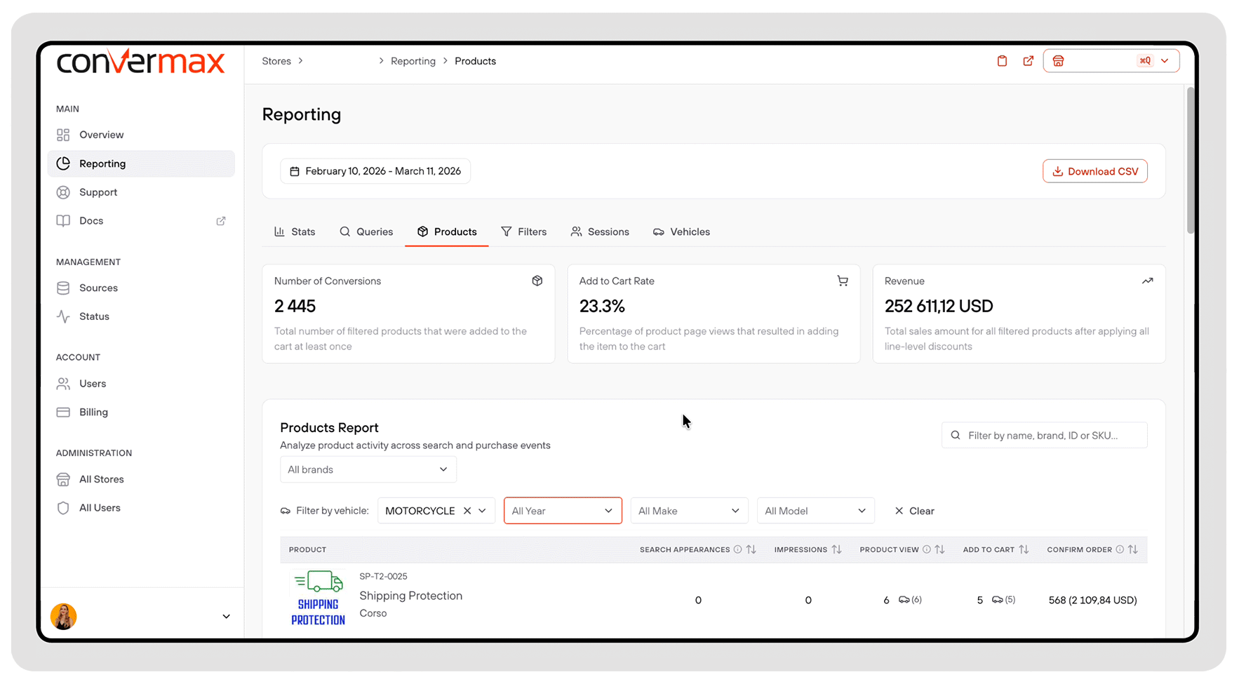 To access this data, go to Convermax Dashboard → Reporting. Click on the Products section.