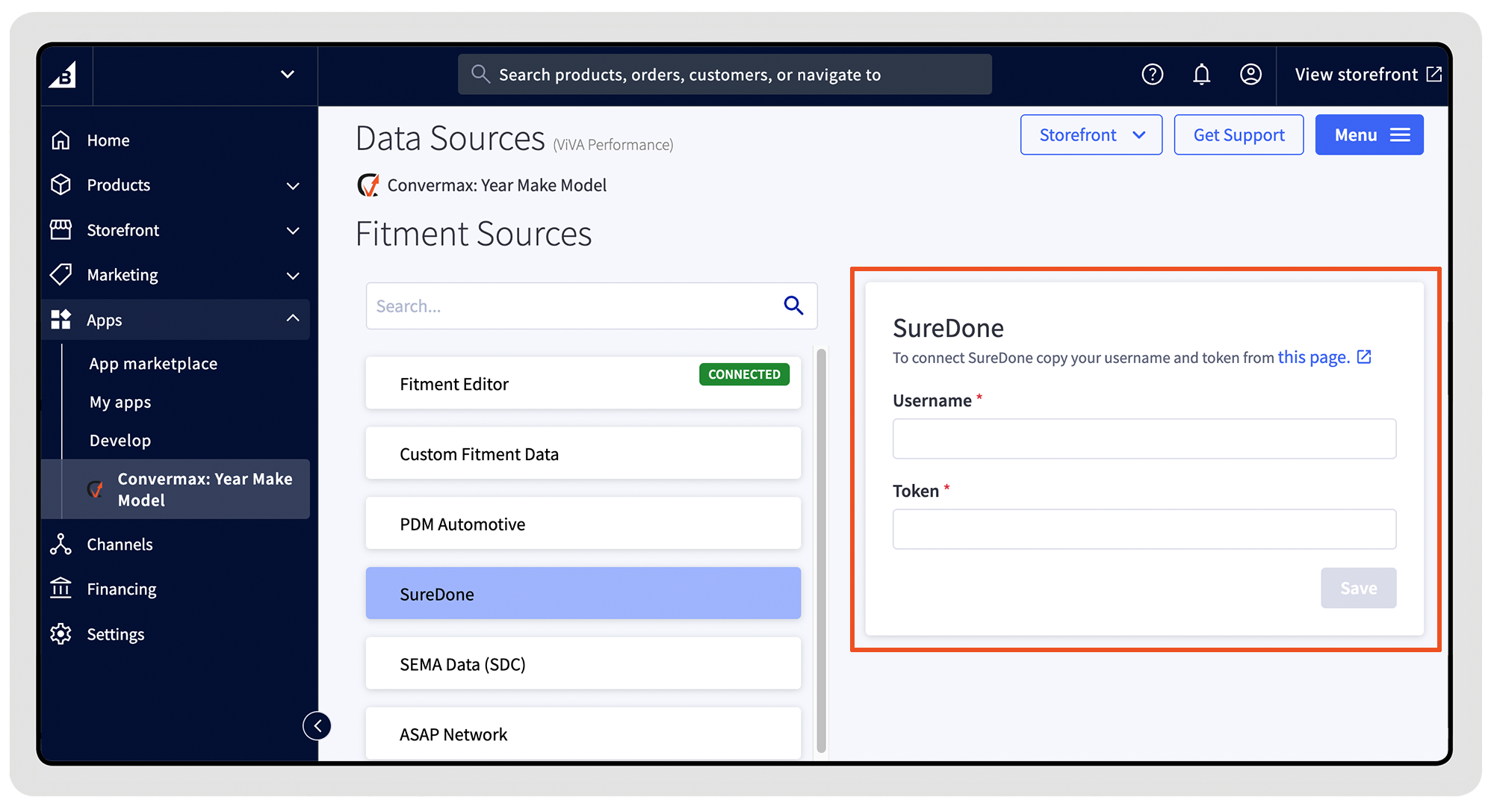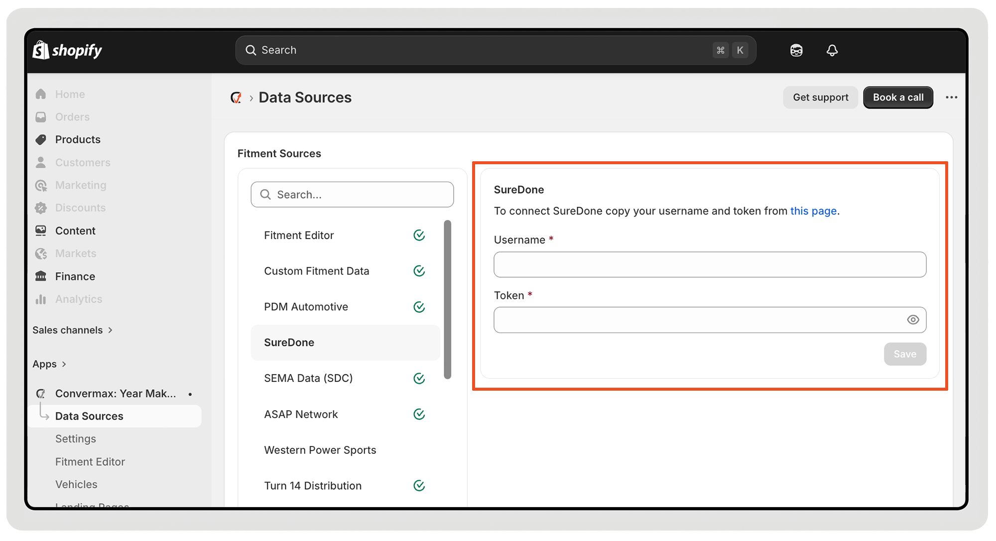 Merchants who manage their data via SureDone can connect it as a data source inside the Convermax app. To enable it, simply enter your SureDone username and API token. Once added, the connection is established, and your data from SureDone becomes available for indexing and use inside your store.