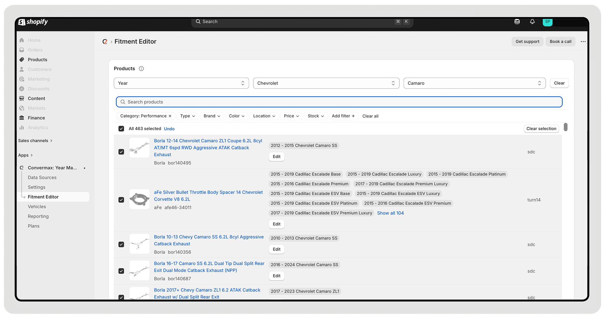 Now you can view all products in your store alongside their assigned fitments inside the Fitment Editor. Also, we added Year-Make-Model lookup, filters, and a search bar, so you can easily navigate through them. You can sort products by category, brand, price, stock, fitment source, etc. Combine filters, find the products that need changes, and update them in bulk.
