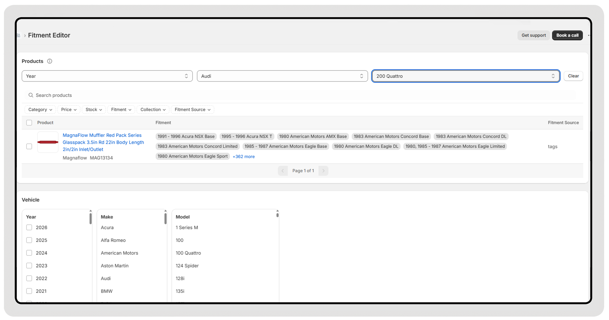 Merchants can combine multiple filters, select all matching products, and apply bulk actions with a single click. For example, you can quickly find all products that fit a specific vehicle and review or update their fitment. Another use-case scenario: you can locate products missing fitment data and fix them all together.