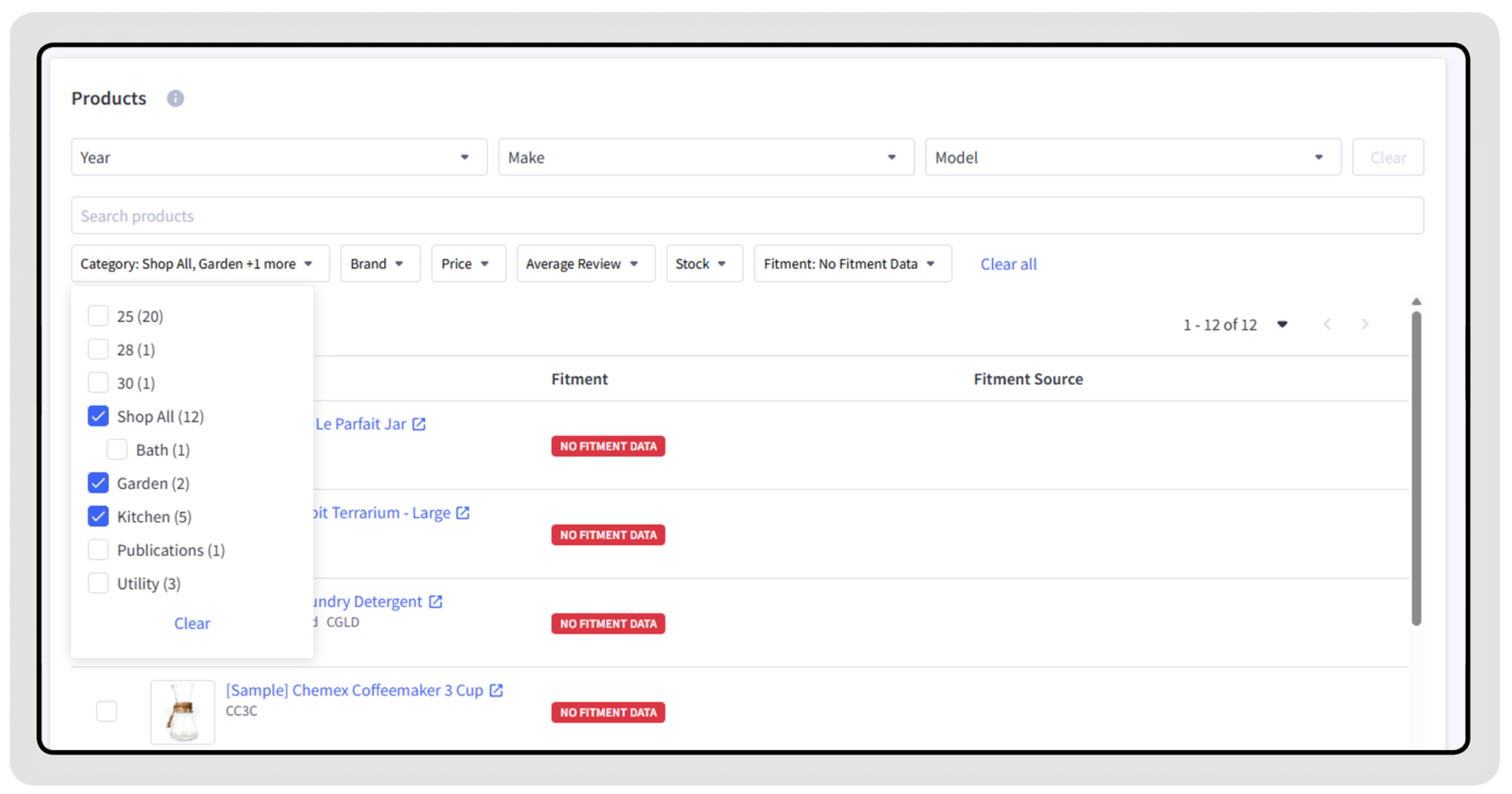 The Fitment Editor now includes a Year Make Model bar, allowing merchants to filter all store products by vehicle. This makes it easy to view products assigned to a specific vehicle and update them in bulk when needed. We also added other filters to sort products by: